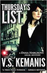 Making Connections - ARCHIVES: 874. THURSDAY'S LIST, A ... THURSDAY'S LIST, A DANA HARGROVE LEGAL MYSTERY by V.S. Kemanis ... Genre: Legal suspense/mystery Book Description: "An intelligent mystery about a career lawyer trapped between the professional and the personal Kemanis descriptions are outstanding Her overall attention to detail makes the work a true page-turner. Kirkus Reviews Homicide Chart, A Dana Hargrove Legal Mystery, by V.S. Kemanis a Dana Hargrove legal mystery. Prosecutor Dana Hargrove has left those rookie days of Thursdays List far behind. Its 1994, and the murder rate in New York City is sky high. Now an experienced trial attorney, Dana belongs to an elite cadre of prosecutors on the homicide chart, a rotating schedule of on-call responders to murder scenes. Thursday's List (A Dana Hargrove Legal Mystery Book 1 ... Thursday's List (A Dana Hargrove Legal Mystery Book 1) - Kindle edition by V.S. Kemanis. Download it once and read it on your Kindle device, PC, phones or tablets. Use features like bookmarks, note taking and highlighting while reading Thursday's List (A Dana Hargrove Legal Mystery Book 1).
